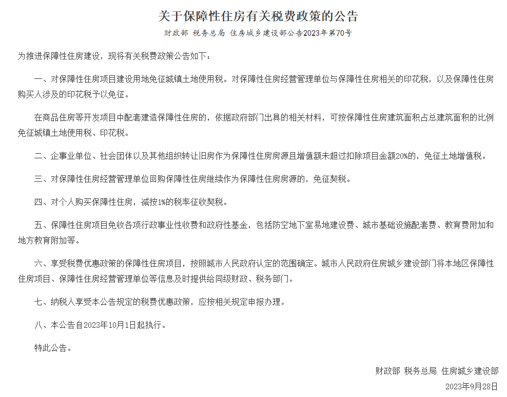 财政部、税务总局和住房城乡建设部联合发布《关于保障性住房有关税费政策的公告》(财政部、税务总局、住房城乡建设部公告2023年第70号),提出包括保障房项目免征土地使用税、保障房经营和购买免征印花税、旧房转保障房增值不超过扣除项目金额20%免征土地增值税、回购保障房作为房源免征契税、个人认购保障房减按1%征收契税、保障房免征各类行政事业性收费和政府性基金等七条税收优惠政策。