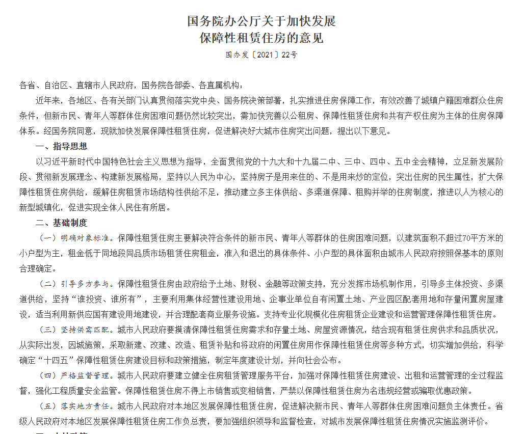 《国务院办公厅关于加快发展保障性租赁住房的意见》(国办发〔2021〕22号)指出,“坚持以人民为中心,坚持房子是用来住的、不是用来炒的定位,突出住房的民生属性,扩大保障性租赁住房供给,缓解住房租赁市场结构性供给不足,推动建立多主体供给、多渠道保障、租购并举的住房制度,推进以人为核心的新型城镇化,促进实现全体人民住有所居”。在该意见中提出,要“进一步完善土地支持政策”、“简化审批流程”、“给予中央补助资金支持”、“降低税费负担”、“执行民用水电气价格”、“进一步加强金融支持”的一揽子支持计划。