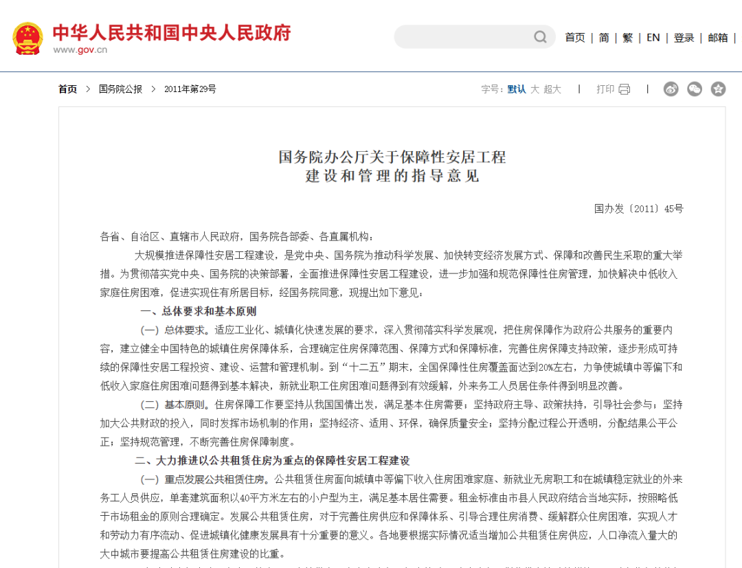 国务院办公厅颁布《国务院办公厅关于保障性安居工程建设和管理的指导意见》(国办发〔2011〕45号,以下简称“45号文”),提出“合理确定住房保障范围、保障方式和保障标准,完善住房保障支持政策,逐步形成可持续的保障性安居工程投资、建设、运营和管理机制。到“十二五”期末,全国保障性住房覆盖面达到20%左右,力争使城镇中等偏下和低收入家庭住房困难问题得到基本解决,新就业职工住房困难问题得到有效缓解,外来务工人员居住条件得到明显改善。”
