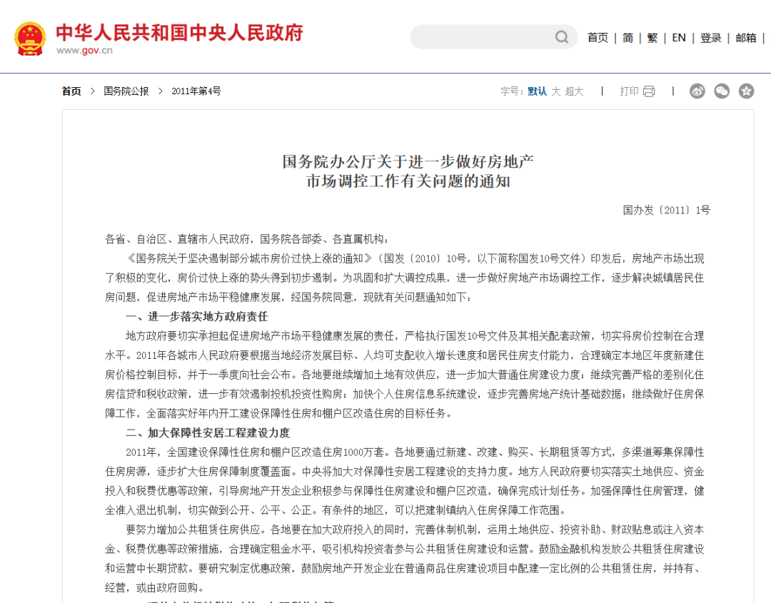 由于“四万亿”计划也带来了⼀些房地产投资过热的问题,为继续做好房地产市场调控工作,2011年1月26日,国务院办公厅颁布《国务院办公厅关于进一步做好房地产市场调控工作有关问题的通知》(国办发〔2011〕1号,以下简称“新国八条”)。