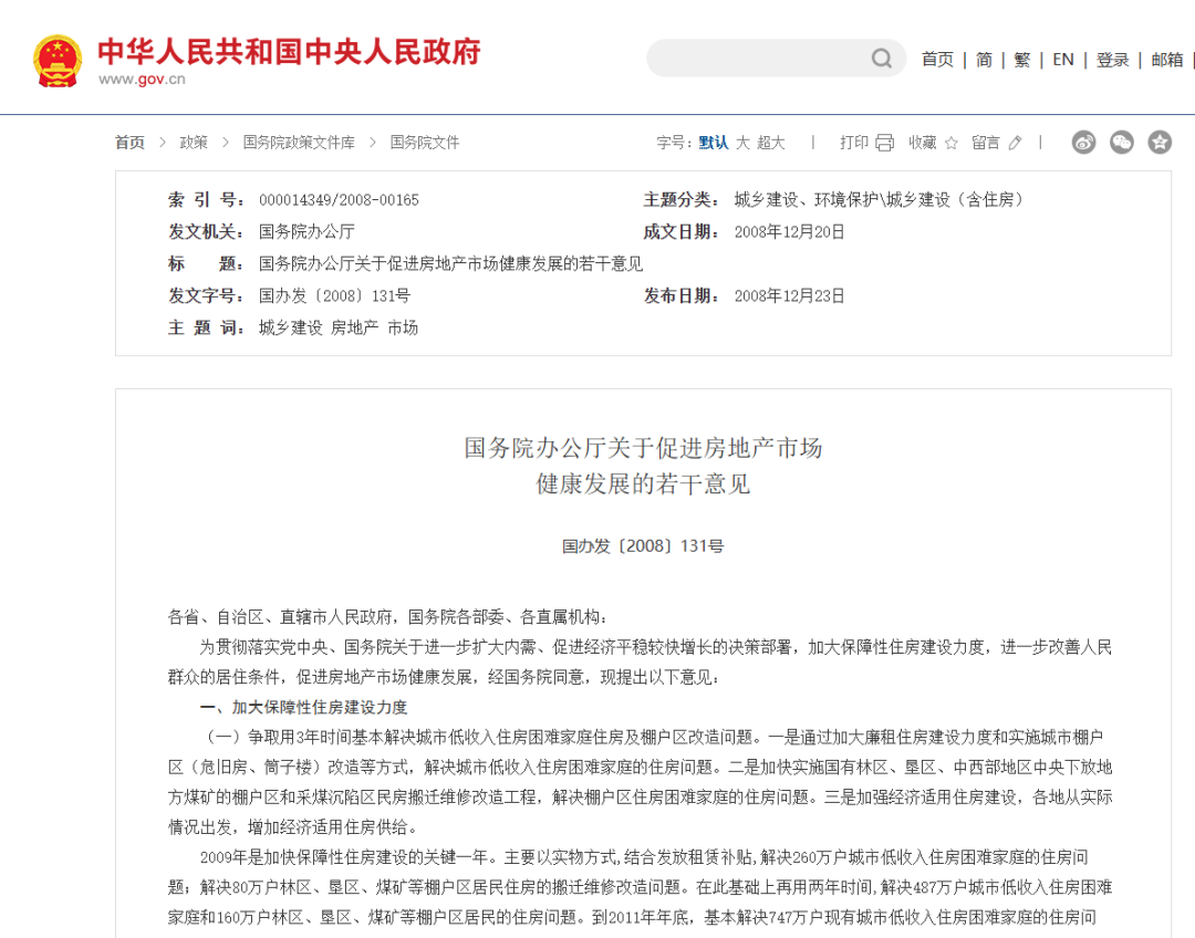 2008年12月20日国务院出台《关于促进房地产市场健康发展的若干意见》(国办发〔2008〕131号),要求加快建立以廉租住房为重点、包括经济适用住房在内的多渠道解决城市低收入家庭住房困难的政策体系。同时,针对大量的城市、工矿(含煤矿)、林区、垦区棚户区居民住房困难、居住环境差的问题,开始对各类棚户区实施改造;推动部分商品住房价格上涨较快的大中城市建设限价商品住房;从2010年开始,在大中城市建设公共租赁住房。