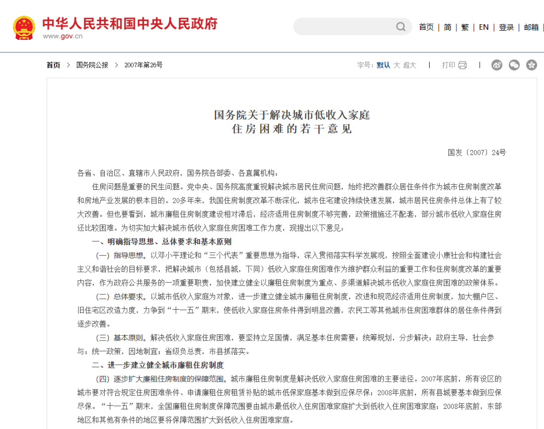 国务院出台《国务院关于解决城市低收⼊家庭住房困难的若干意见》(国发(2007)24 号,以下简称“24号文”)。