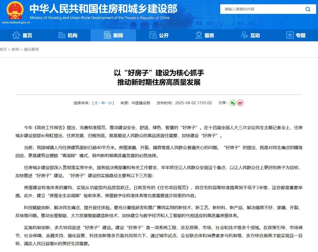 适应人民群众高品质居住需要,完善标准规范,推动建设安全、舒适、绿色、智慧的“好房子”。