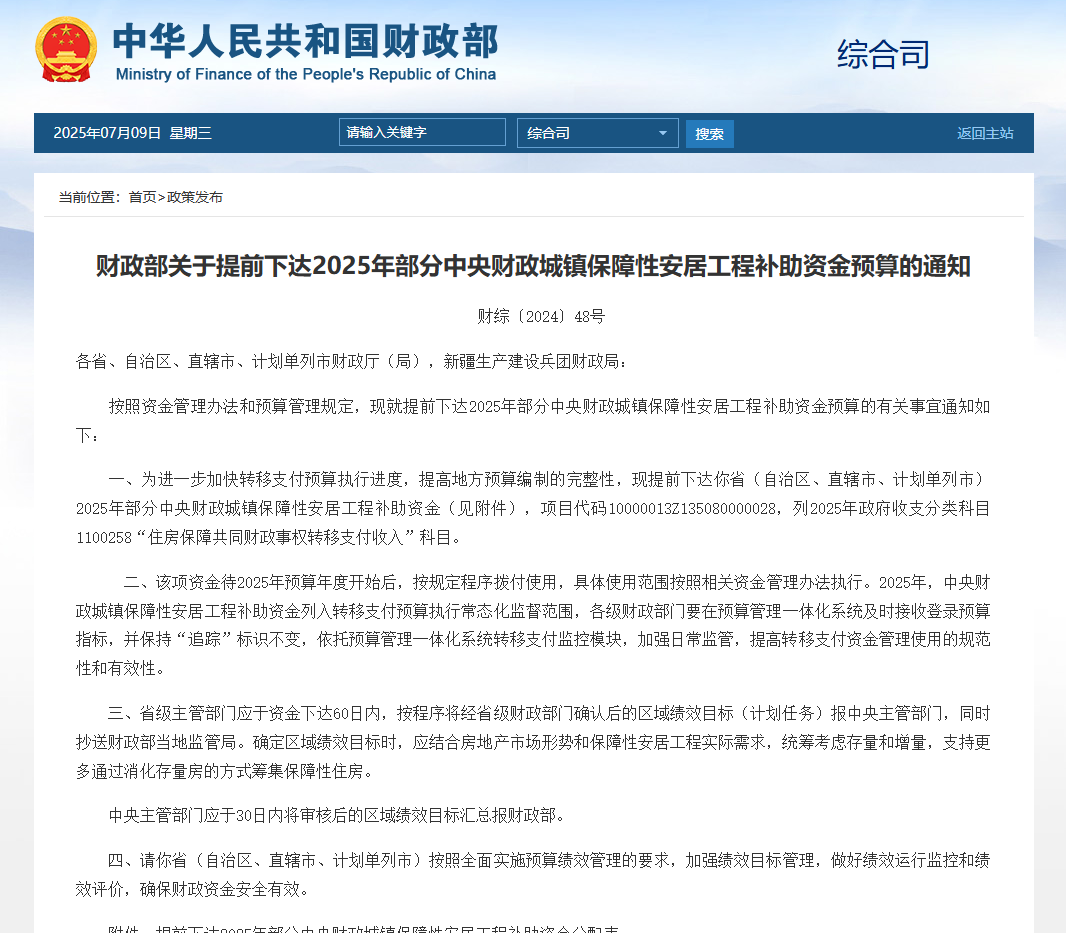 在《财政部关于提前下达2025年部分中央财政城镇保障性安居工程补助资金预算的通知》(财综〔2024〕48号)中,财政部要求各省、自治区、直辖市、计划单列市财政厅(局),新疆生产建设兵团的省级主管部门在“确定区域绩效目标时,应结合房地产市场形势和保障性安居工程实际需求,统筹考虑存量和增量,支持更多通过消化存量房的方式筹集保障性住房。”并“按照全面实施预算绩效管理的要求,加强绩效目标管理,做好绩效运行监控和绩效评价,确保财政资金安全有效。”