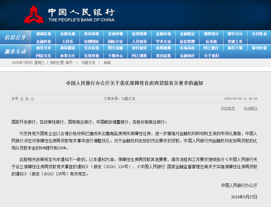 中国人民银行发布《中国人民银行办公厅关于优化保障性住房再贷款有关要求的通知》,在该文件中指出,“为支持地方国有企业以合理价格收购已建成未出售商品房用作保障性住房,进一步增强对金融机构和收购主体的市场化激励,中国人民银行决定对保障性住房再贷款有关事项进行调整优化。对于金融机构发放的符合要求的贷款,中国人民银行向金融机构发放再贷款的比例从贷款本金的60%提升到100%。”