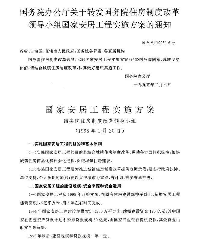 国务院住房制度改革领导小组发布《国家安居工程实施方案》(以下简称“安居工程实施方案”,现已失效),“加快城镇住房商品化和社会化进程,促进城镇住房建设”。