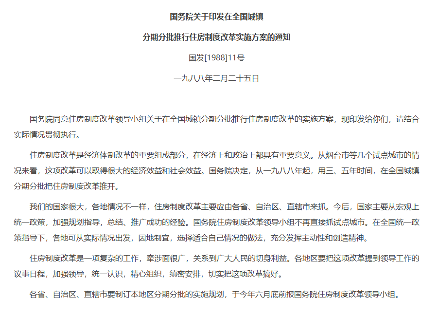 同年2月25日,国务院颁布《关于印发在全国城镇分期分批推行住房制度改革实施方案的通知》,同意住房制度改革领导小组关于在全国城镇分期分批推行住房制度改革的实施方案,提出了“按照社会主义有计划的商品经济的要求,实现住房商品化”的城镇住房制度改革(以下简称“房改”)目标。