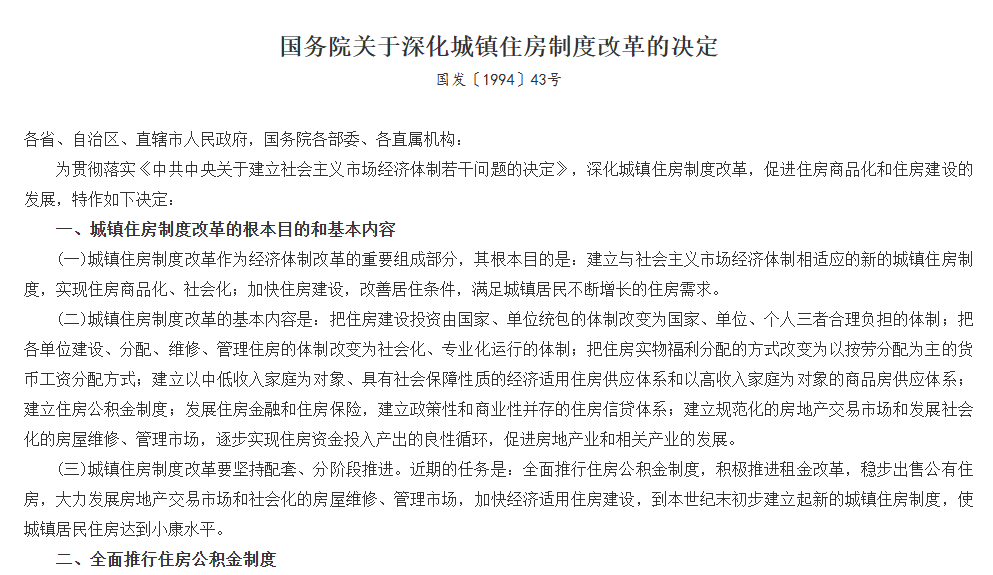 国务院颁布《国务院关于深化城镇住房制度改革的决定》(国发〔1994〕43号,以下简称“43号文”,现已失效),要求“深化城镇住房制度改革,促进住房商品化和住房建设的发展”。