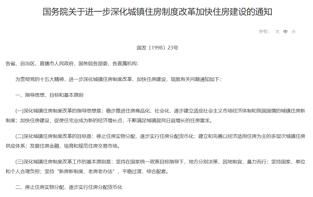 国务院印发了《关于进一步深化城镇住房制度改革加快住房建设的通知》(国发〔1998〕23号),提出停止住房实物分配,推进住房商品化、社会化;对最低收入住房困难家庭提供廉租住房,对中低收入住房困难家庭供应经济适用住房。